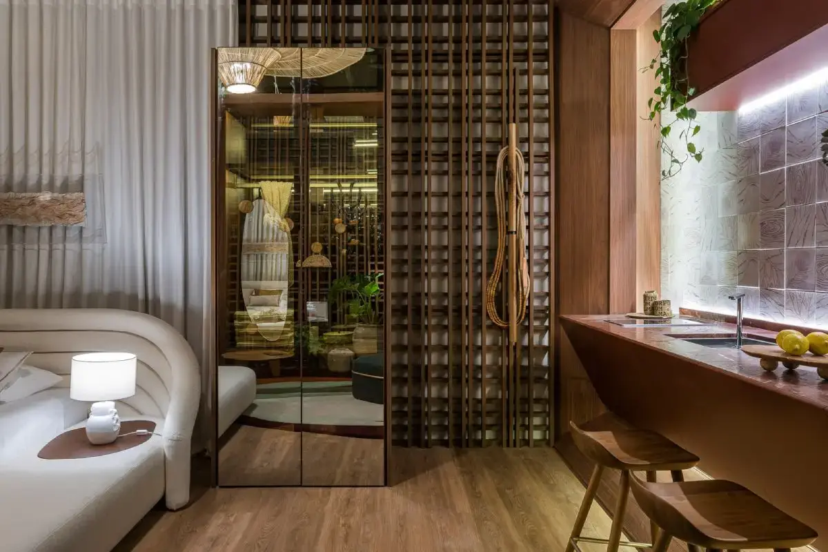 A marca foi responsável pelo desenvolvimento de todo o ambiente planejado deste estúdio elegante e refinado de 40m². Nomeado como "Espelho da Alma", o projeto foi pensado para se desconectar do mundo e se conectar consigo mesmo, como uma verdadeira janela da alma, ideal para os momentos de descanso e descanso. Para despertar os sentidos de acolhimento e bem-estar, a arquiteta escolheu uma paleta de cores em tons de marrom, marsala e terracota em contraste com tons claros de beges e verdes.