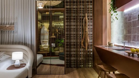 Outro destaque é o Muxarabi que delimita o ambiente e reforça a ideia de 'ver através'. Segundo ela, "lindamente apresentado pela Criar, foi como alma para uma e sua história do novo conceito de morar, guiado pelos novos comportamentos humanos pós-pan-pan".
