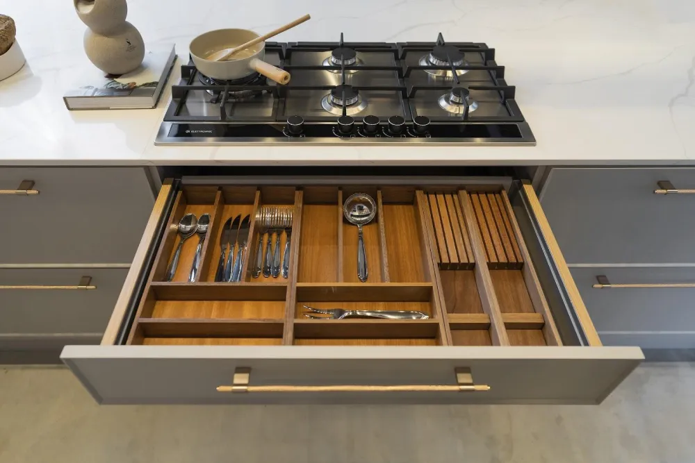 Gavetas organizadoras: além de profundas e amplas, essas gavetas vêm com divisórias personalizáveis, permitindo a organização perfeita de utensílios e ferramentas de cozinha.