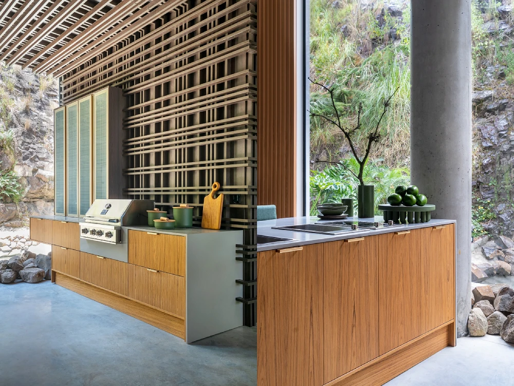 Elementos Naturais: madeiras resistentes à umidade, como teca ou cedro, podem ser utilizadas nos móveis. Além de serem duráveis, essas madeiras têm tonalidades que se harmonizam com o ambiente praiano, e são super resistentes à maresia. A teca é um dos materiais mais resistentes, junto ao aço inoxidável e o galvanizado.