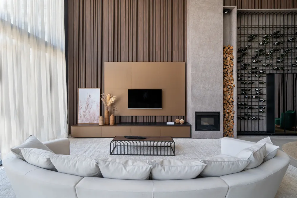 No living moderno, a tecnologia é uma presença quase obrigatória. No entanto, para manter o ambiente aconchegante, é importante que os dispositivos, como TVs, assistentes virtuais e sistemas de som, sejam integrados de forma discreta. Móveis planejados são uma excelente solução para esconder cabos e outros componentes tecnológicos, mantendo a estética do espaço.