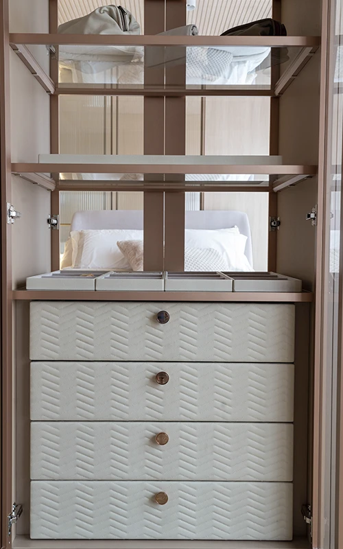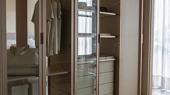 O vidro aparece como um aliado estratégico, seja em portas de correr, prateleiras ou nichos. Sua transparência adiciona modernidade e leveza, ao mesmo tempo em que valoriza peças em exposição sem comprometer o estilo minimalista. Em closets abertos, o uso desse material também contribui para a sensação de organização, já que cria um visual limpo e sofisticado.
