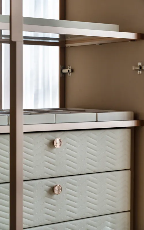 As cores são determinantes para dar personalidade aos closets abertos e, neste ano, a tendência é apostar em paletas neutras, mas com profundidade e textura. Tons como bege, cinza e marrom surgem em versões mais sofisticadas, acompanhados de acabamentos acetinados ou levemente texturizados, que adicionam riqueza visual.