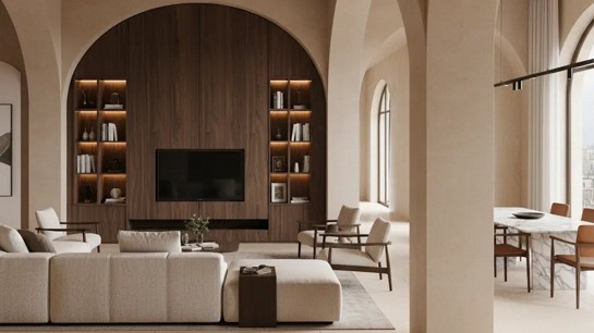Os livings planejados se beneficiam da combinação entre arcos e painéis ripados, unindo a fluidez romana com a verticalidade grega. O resultado é um ambiente que inspira convivência, conforto e estética contemporânea.