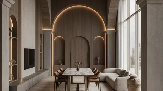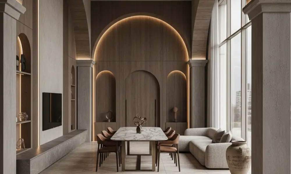 No design contemporâneo, essa herança aparece de forma elegante e atualizada. Arcos surgem em portas, divisórias, nichos e até em móveis, criando um visual leve e acolhedor. Painéis com cantos arredondados suavizam a transição entre ambientes, enquanto volumetrias mais imponentes dão protagonismo a halls, salas e cozinhas. A mistura de pedra, metal, vidro e madeira também tem origem romana, equilibrando solidez e sofisticação.