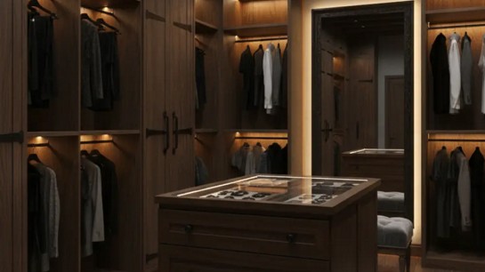 Em closets e dormitórios planejados, essas referências resultam em espaços sensoriais e refinados. A combinação de madeiras escuras, iluminação LED quente e metais marcantes cria ambientes com personalidade e atmosfera, mesclando tradição e modernidade com equilíbrio.