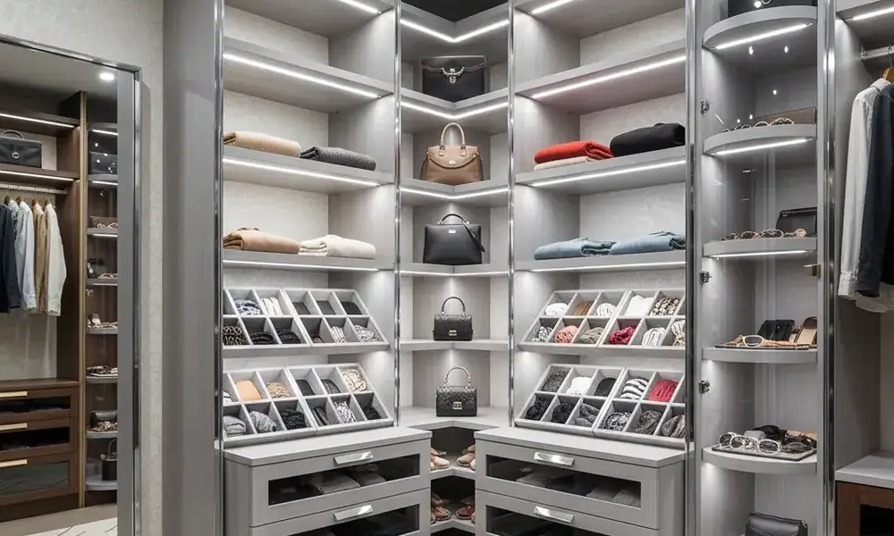 Em closets pequenos, os acessórios assumem papel estratégico. Cabideiros basculantes, gavetas com divisórias internas, calceiros deslizantes e soluções retráteis aumentam a capacidade de armazenamento sem ampliar a área ocupada.